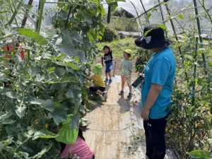 早速ぽっぷる農園に行き、自分で選んだきゅうりやなすを収穫しました。