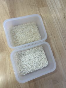 クイズにも挑戦!!みんながいつも給食で食べているお米と、鏡もちで使うもち米。