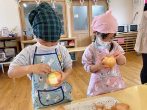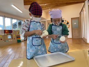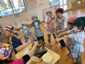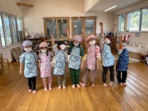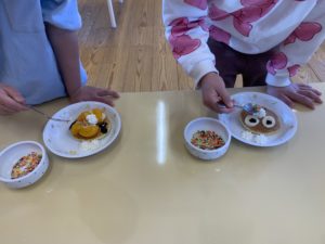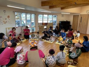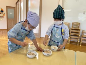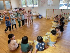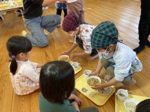 小さいお友達にちこひのみんなで作った豚汁とおむすびを配膳